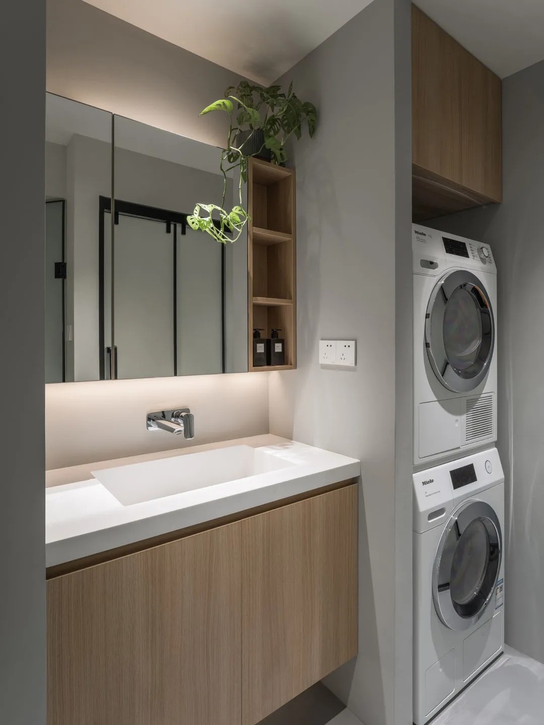 厨房外移后,将卫生间及厨房空间重组改造,打造四分离卫生间,最 大程度地缓解了早晚高峰期使用卫生间的紧张。微水泥材质与原木材质的碰撞,轻描淡写地描绘出些许自然轻松。