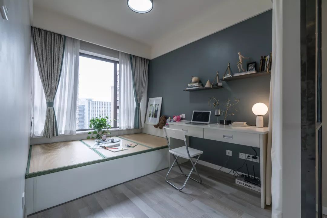 书房处靠窗布置了一个榻榻米地台,方便屋主在工作之后休憩一些,书桌的上方搭配隔板来做收纳,让书房看起来更加简洁大方。