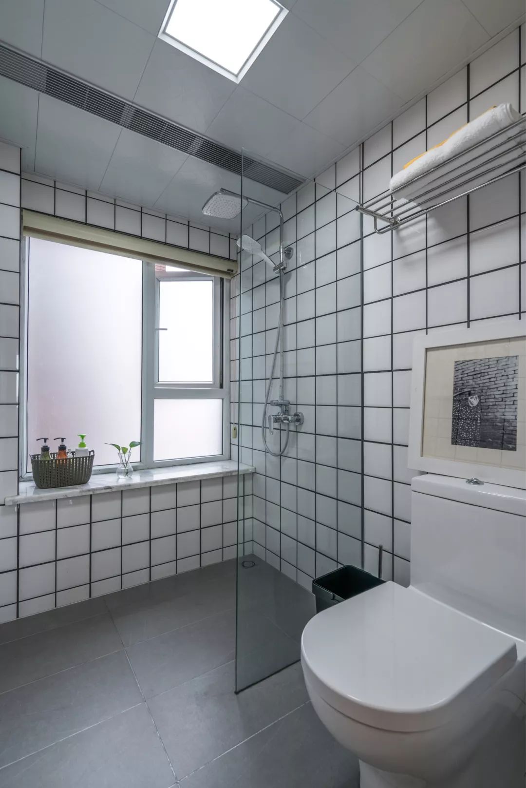 卫生间内用一块玻璃隔断来划分湿区和干区,充分利用窗台和马桶上方的空间来做收纳,让卫生间变得更为实用一些。
