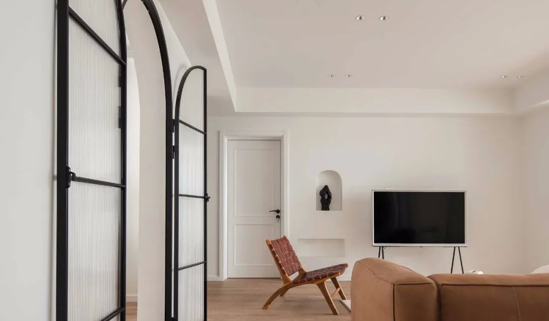 ▲双开拱形门是多功能影音室的门片,选择一个南瓜懒沙发搭配曲木中古落地灯