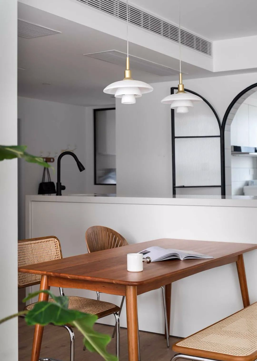 ▲餐厅与西厨岛台结合,实木与藤编家具,搭配清新简约的吊灯,转角处,搭配一个多功能复古角柜,材质呈现与餐桌相仿
