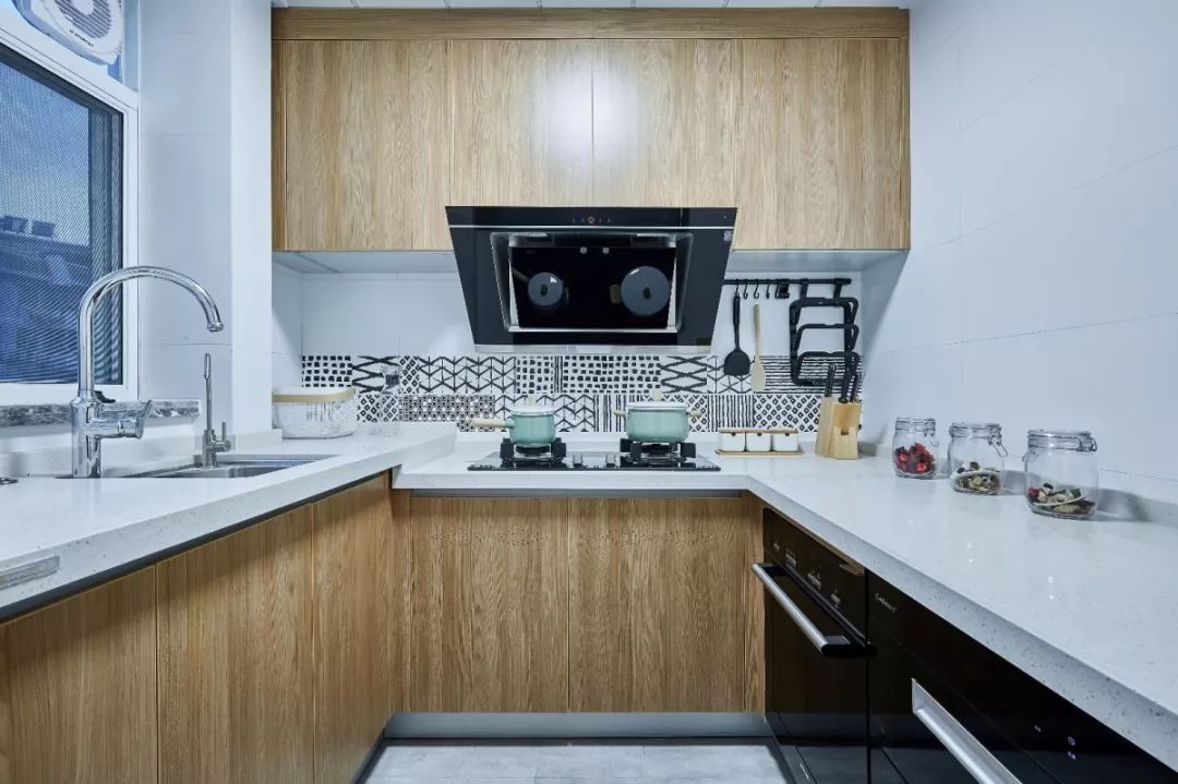 厨房以木色柜子为视觉中心,白色墙砖与台面,整个空间简洁清爽。U型厨房设计,功能规划合理,让下厨变得更加得心应手。