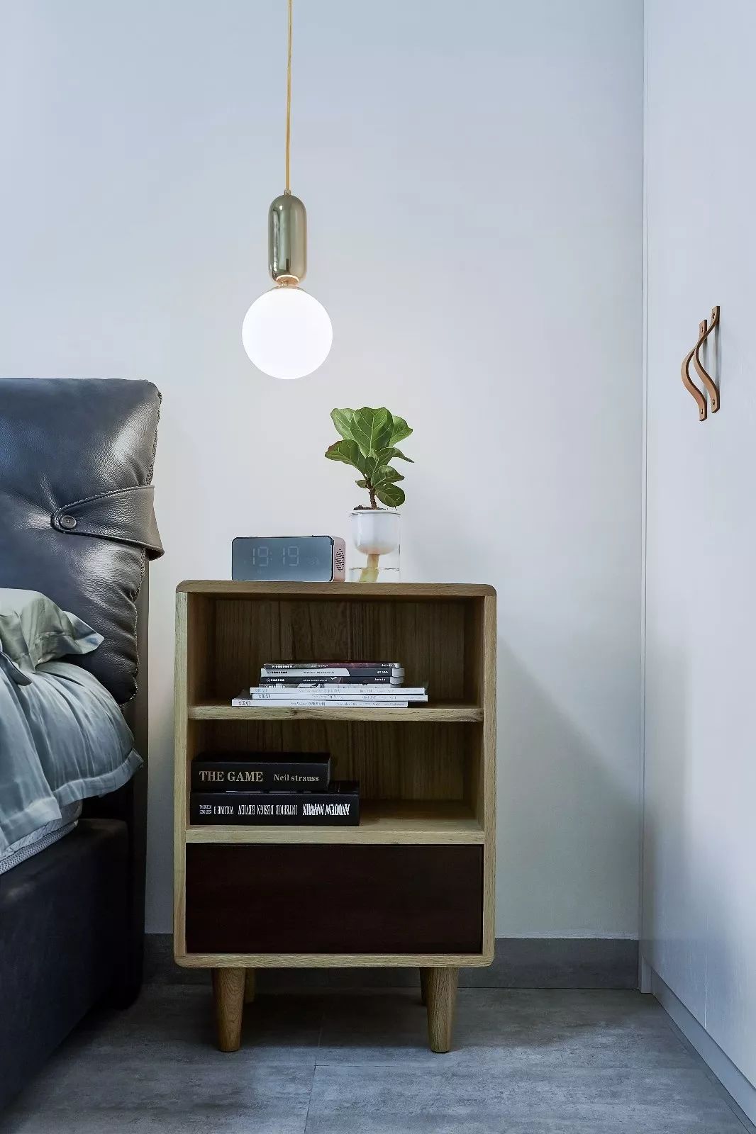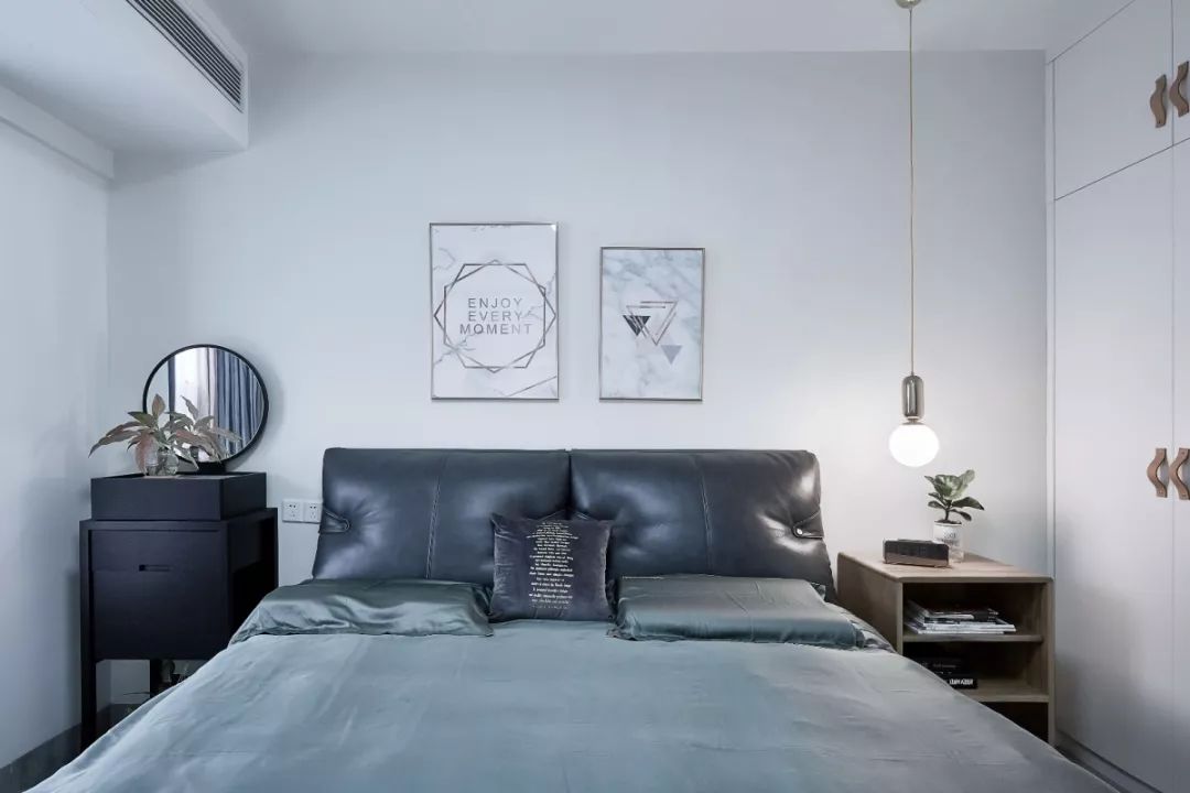 主卧整体以白色为主调,黑色皮质床头和黑色床头收纳柜,年轻时尚且舒适度、实用性都得到了满足。