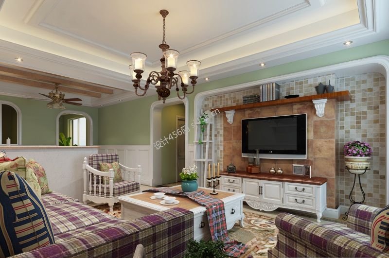 129平田园风格新房客厅电视墙装潢效果图