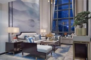 整体空间宽敞明亮,在装饰上选择了沉稳端庄的新中式风格配色,营造出高级端庄的典雅气息。客厅空间高挑,选用渐变的蓝色装饰画作为背景墙,沙发实木与布艺软装结合,是新中式装修中的特点,既典雅端庄又不失舒适感。大理石面茶几给空间带来古韵与时尚共存的韵味。效果图