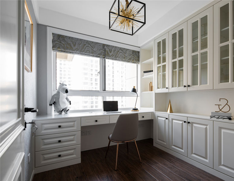 窗帘的选择有很多种,有百叶窗、卷帘、垂直帘等,装窗帘的目的在于能很好的把光线遮挡,材料的选择上要厚实,这样才能有效的遮光闭热,在读书或办公的时候就不会被窗外的强光照射进来刺激眼睛。所以装个窗帘是很有用的,不仅美观还起到保护作用。窗帘的颜色选择尽可能和书柜书桌保持一致,这样就能显出整体性。这里有一个细节需要提醒大家,新买的窗帘要经过水洗和日晒后才挂到书房使用,因为新买回来的窗帘经过印花或者染色或多或少都有残余甲醛余留在布料中,通过水洗能溶解残余的甲醛,日晒也可以加快挥发残余的甲醛,所以水洗晒干后的窗帘挂在书房内才不会有异味。