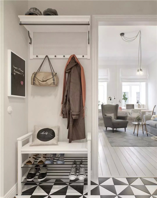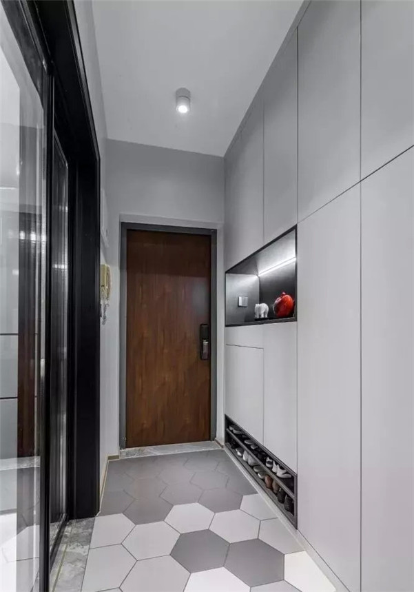 黑、白、深灰、浅灰一应俱全,铺设上黑色作为点缀,不建议大面积使用,尤其小玄关,否则进门黑压压一片,更显压抑。