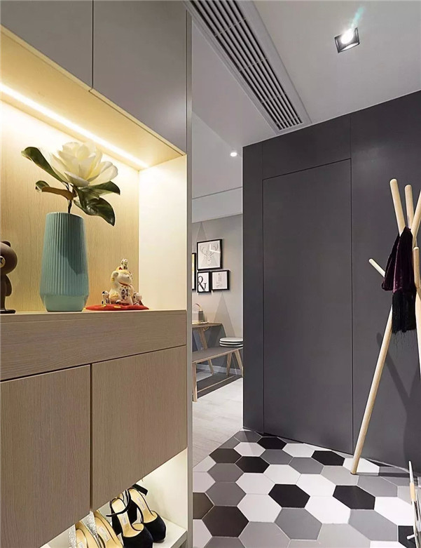 浅色六边砖,与灰色瓷砖的拼接,参差不齐,带着洒脱、凌乱的美感。这样的灰白结合,让玄关的现代质感更为突出了。