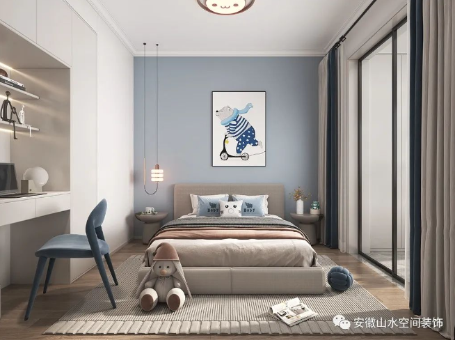儿童房依然以白色为主,搭配淡蓝色元素,简洁明快。原木色的地板与白色定制柜,加上充满童趣主题的元素,看起来更为温馨有爱,为孩子营造出一个健康舒适的成长空间。