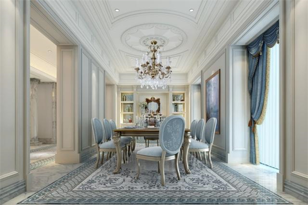4、法式风格整体看起来高端大气,由于现代建筑的层高不足,因此想要装饰出合格的法式风格,现代法式风格的装修就需要从“显高”出发。将吊顶石膏线简化,用花纹细致的石膏线丰富吊顶的层次,同时使用造型简单,线条感丰富的灯饰将层高的折损降到最 低。扩大门洞,将门窗的线条感以纵向的方式调高。门洞和窗洞都打高,窗帘挂到吊顶处,从天花板上垂落下来,不仅在视觉上调高层高,还能增加采光。