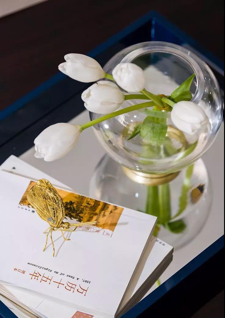 ▲ 茶几上的白色郁金香与金色点缀恰到好处地装扮了空间,彰显出生活中无处不在的优雅浪漫元素。
