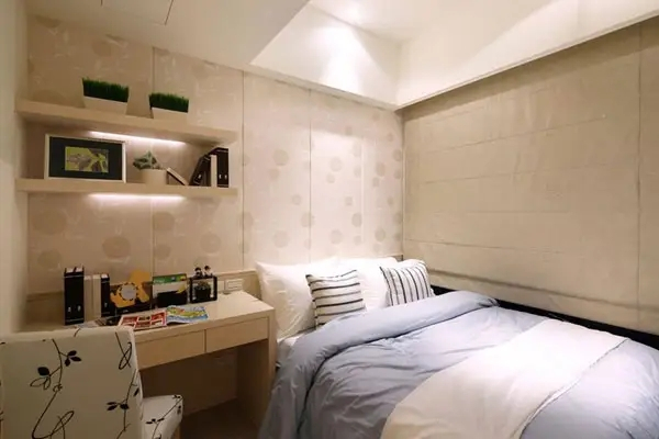1、小卧室的床尽量靠墙摆放,如果中间摆放,两边的过道和床尾都需要留一定空间做活动过道。