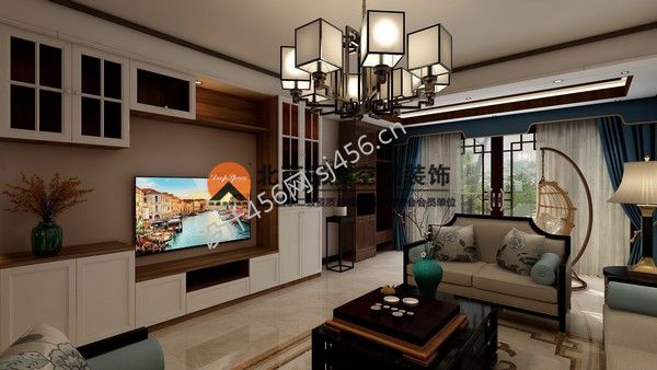 清华园122平方中式风格客厅电视柜组合设计效果图