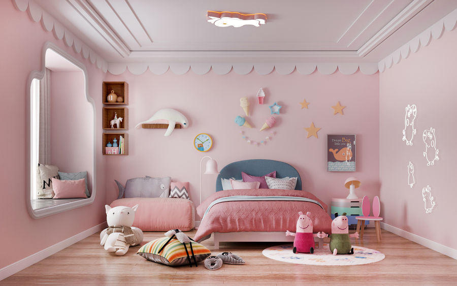 根据儿童的不同性别,在墙面色彩的选择上,建议男孩子浅绿或者浅蓝的方案,女孩子的房间则更多地采用浅粉和米黄色调。