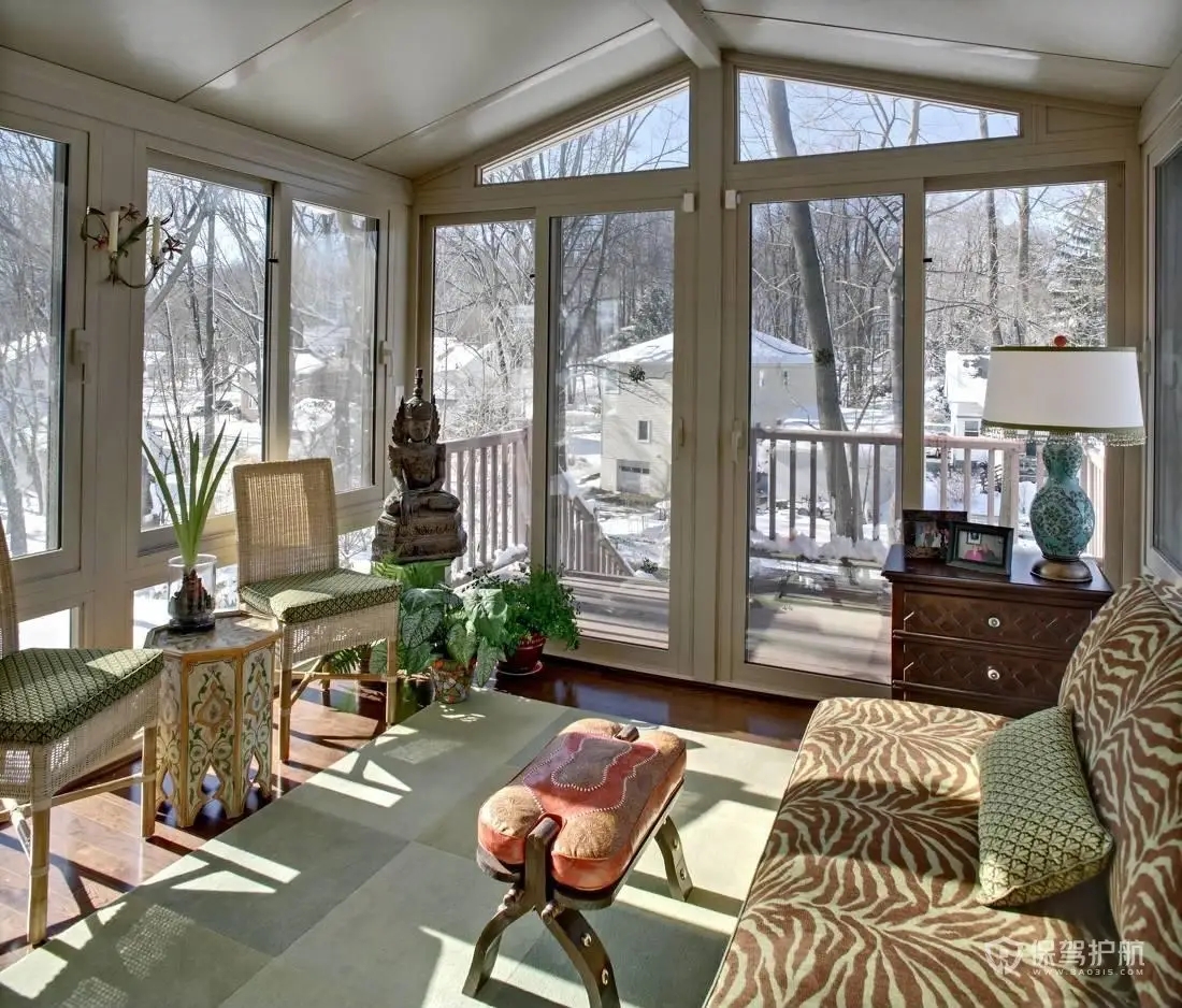 由于玻璃材质以及长期暴露日光下的原因,沙土、灰尘等物极易沾染,清洁以及整体的家居保养问题对阳光房来说也是个大难题,因此如果能有效减少清洁次数或是难度就是个很好的设计。一般来说,阳光房对窗户的要求是具备平开、悬开等多种开启方式,便于打扫。顶棚也会设计成尖形顶或是弧形顶,因为带坡度,可以减少积物的烦恼。