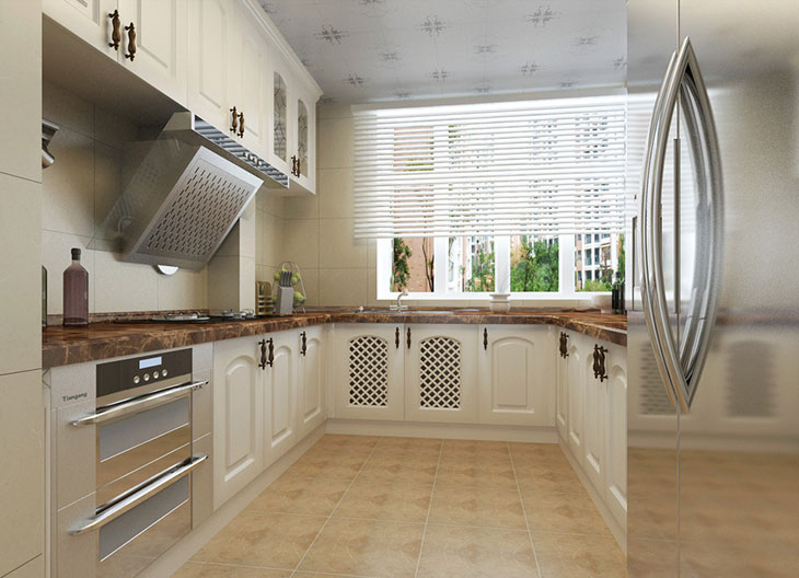 U型厨房设计要注意几点事项:(1)厨房功能布局合理,厨房的主要功能要合理分布,水槽、工作台、炉灶、冰箱要沿着操作流程排列为U字型。否则会因流程不对而产生更多的麻烦。