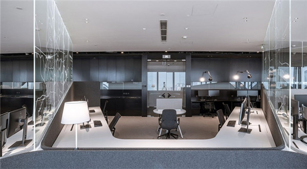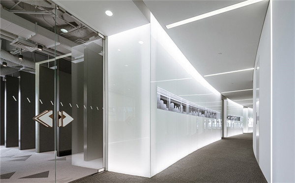 办公室内部被分成了两部分——北侧包含员工工作区域,而南侧专门用于公共区域,如接待处和公司展厅。几乎是黑色的走廊直通工作区,而工作区则以白色为主,为员工创造了明亮轻松的环境。