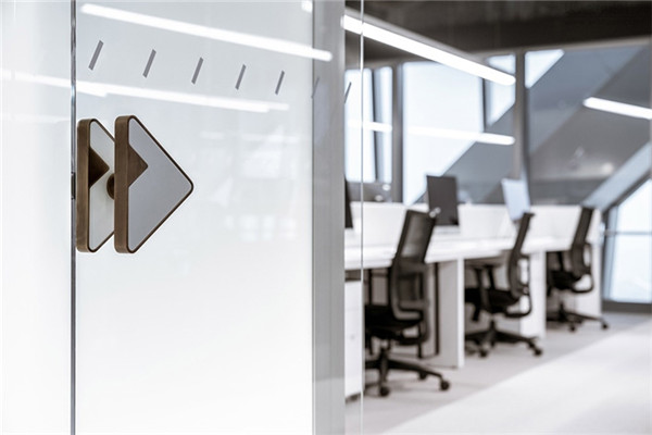 三角形的桌子在房间中呈之字形排列,巧妙地模仿建筑立面上的网格。办公室天花板上的聚光灯、长椅风格的沙发和门把手也是三角形的,与企业标识相呼应。