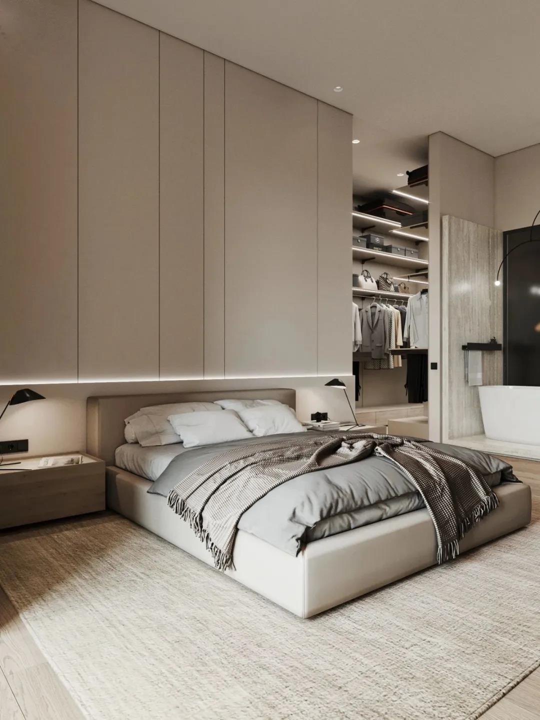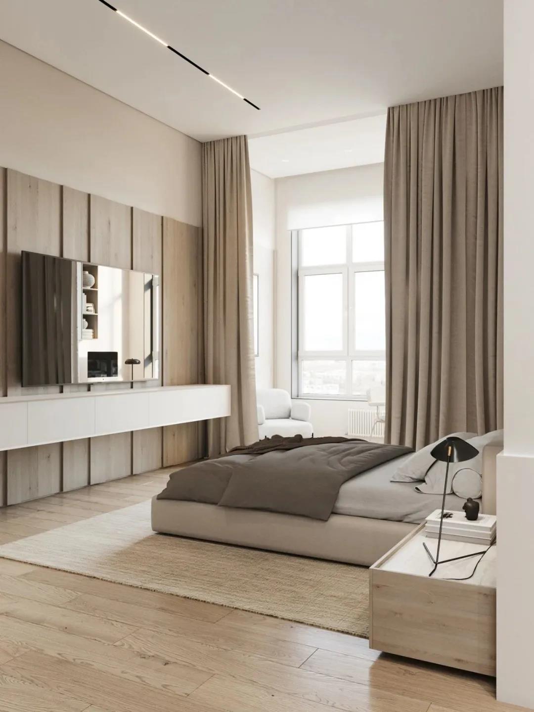 主卧中,中性色调的整体配色,奠定温馨舒适的空间基调。原木材质的床头柜搭配造型极简的黑色床头灯,为主卧增添了暖意。原木地板与电视背景墙相搭配,形成了材质上的呼应。衣帽间位于主卧后方,便于衣物的存放与拿取。