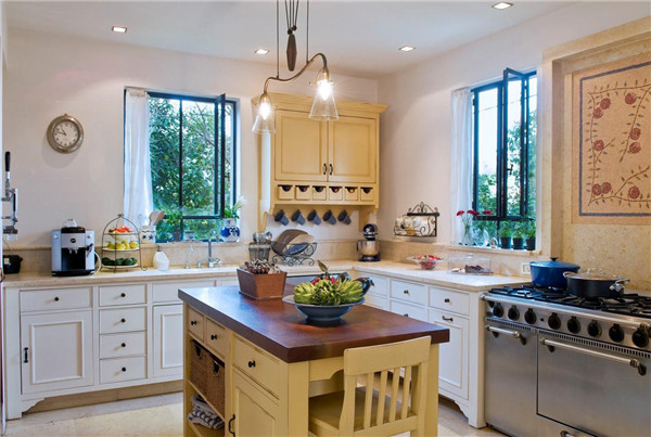 搭配技巧:田园风格厨房多是实木材质,另外实木贴皮,或者吸塑板也可以达到美妙的田园效果。田园风格整体厨房甜美自然而温馨浪漫,如同在木质与设计之间凝具了浓浓情感,让人喜爱不已。