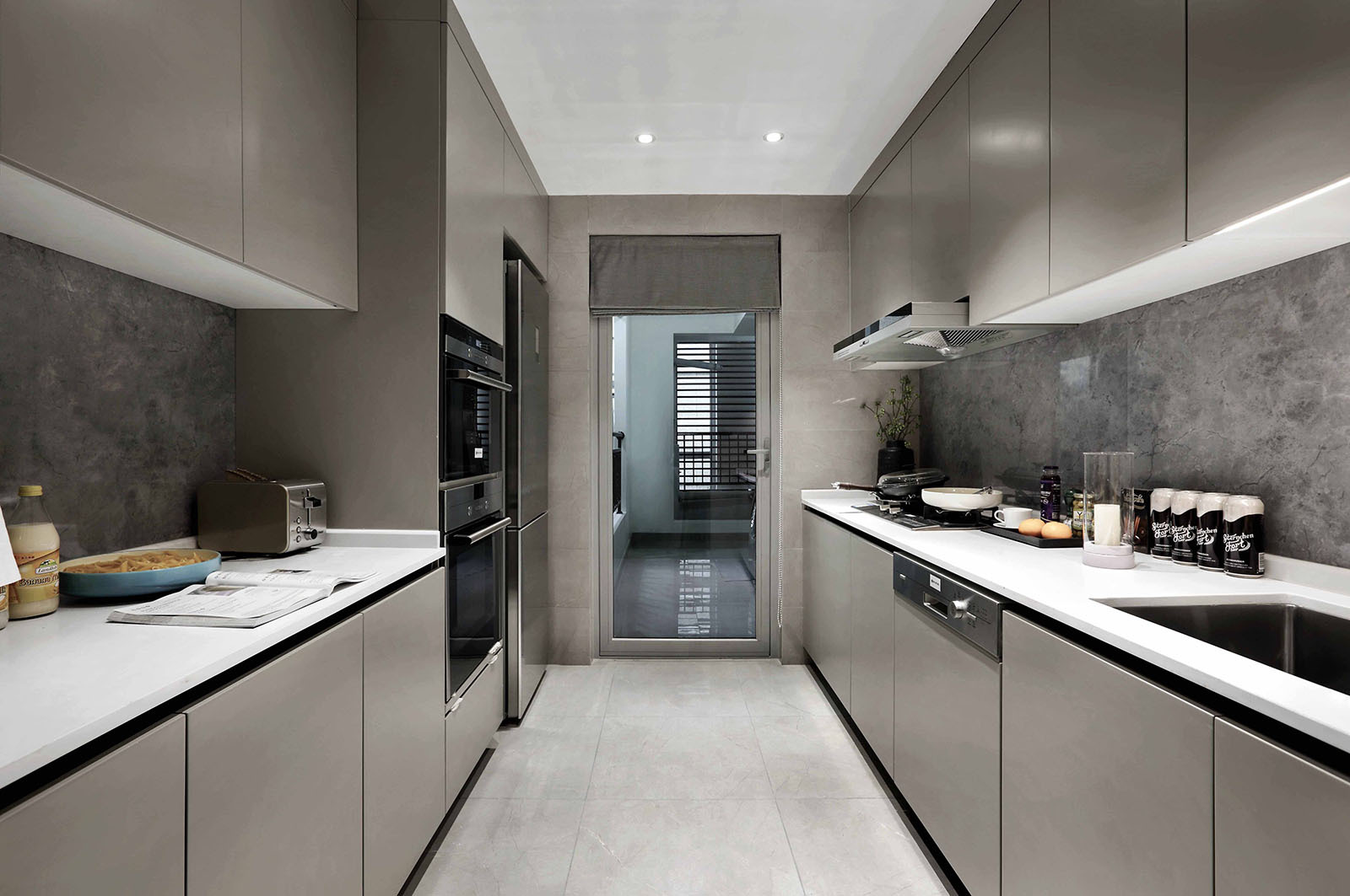 3、过道式,适合于两端都开放的厨房结构。这样的厨房布局通常是利用过道搭建出来的,之所以称为“过道式”就是因为无法设计成“U”或“L”形,因此三个区域只能沿两面墙面排开,三个区之间的走道有可能会比较窄。