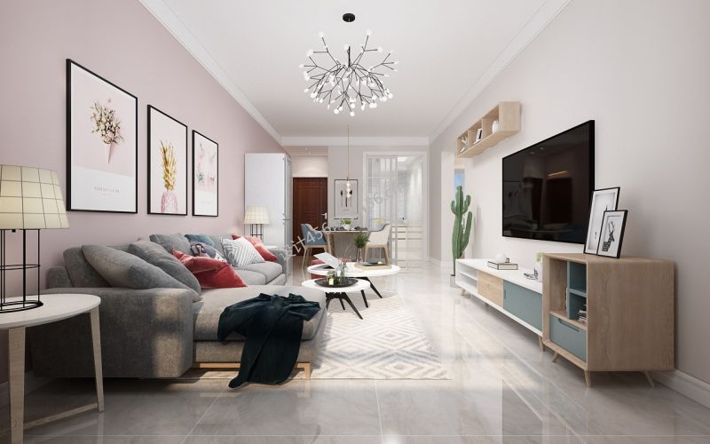 现代北欧风格57平两居客厅粉色墙面设计效果图