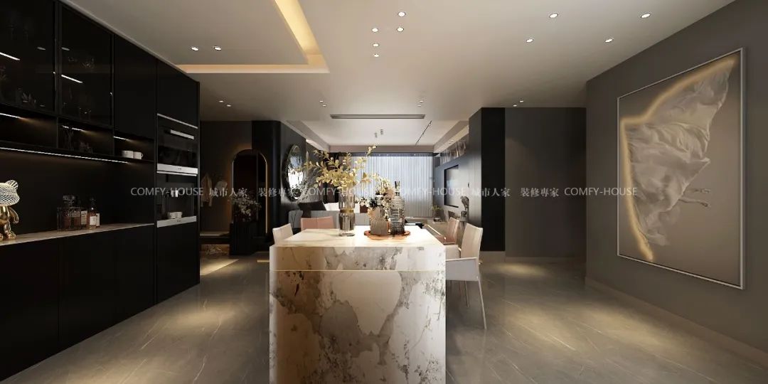 餐桌与白色纹理大理石岛台相结合营造氛围开放式的布局整个客餐厅毫无阻隔空间与空间联通