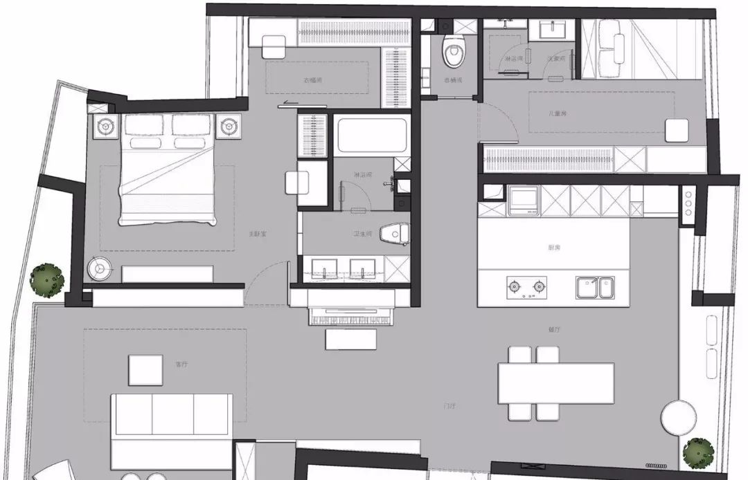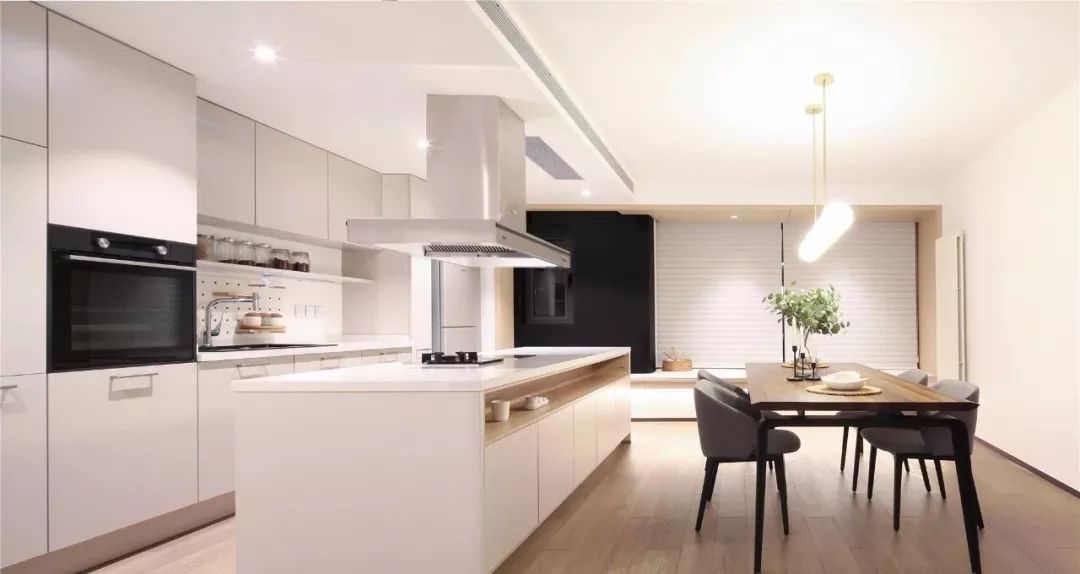 ▲开放式的餐厨格局,厨房与餐桌之间隔着一个中岛台,营造出一个闲适轻松的居住氛围;木质的餐桌搭配舒.适软质的餐椅,摆着绿植与雅致的盘饰,呈现出简洁清新的气质。