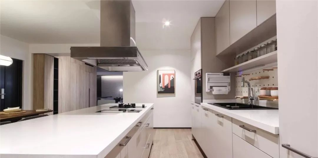 ▲中岛台与厨房操作台连体共用,二字型的操作空间,松动而又实用。