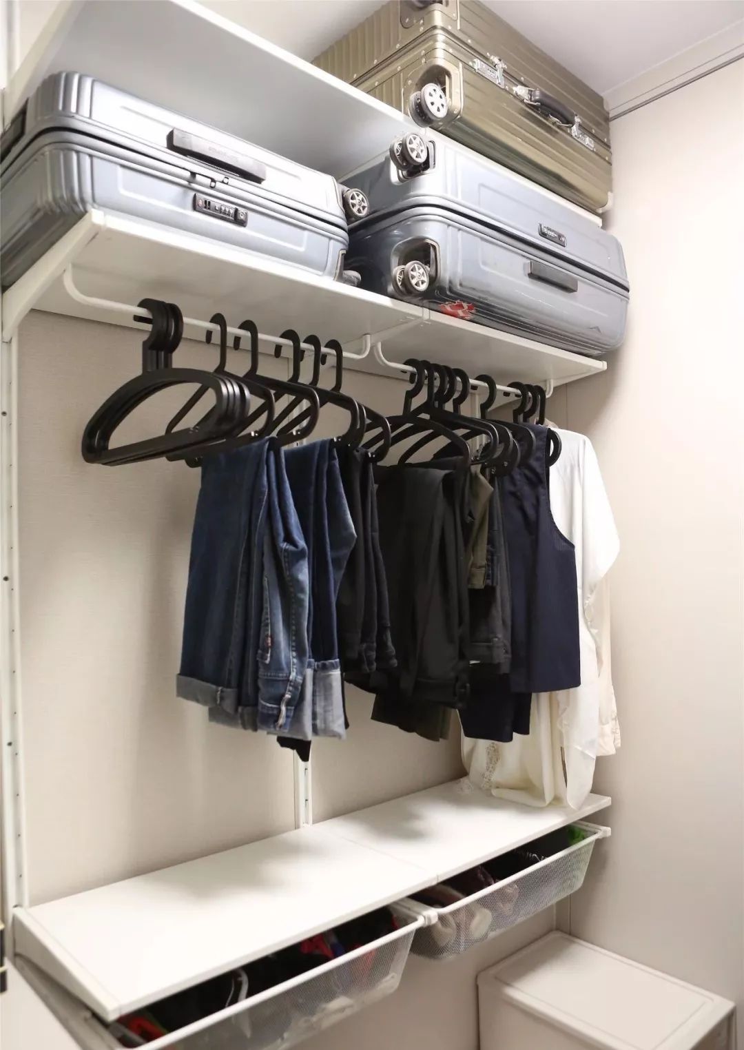 ▲卧室独.立的衣帽间,以开.放式的挂架、收纳盒,让衣物的存储与找寻都更加方便。