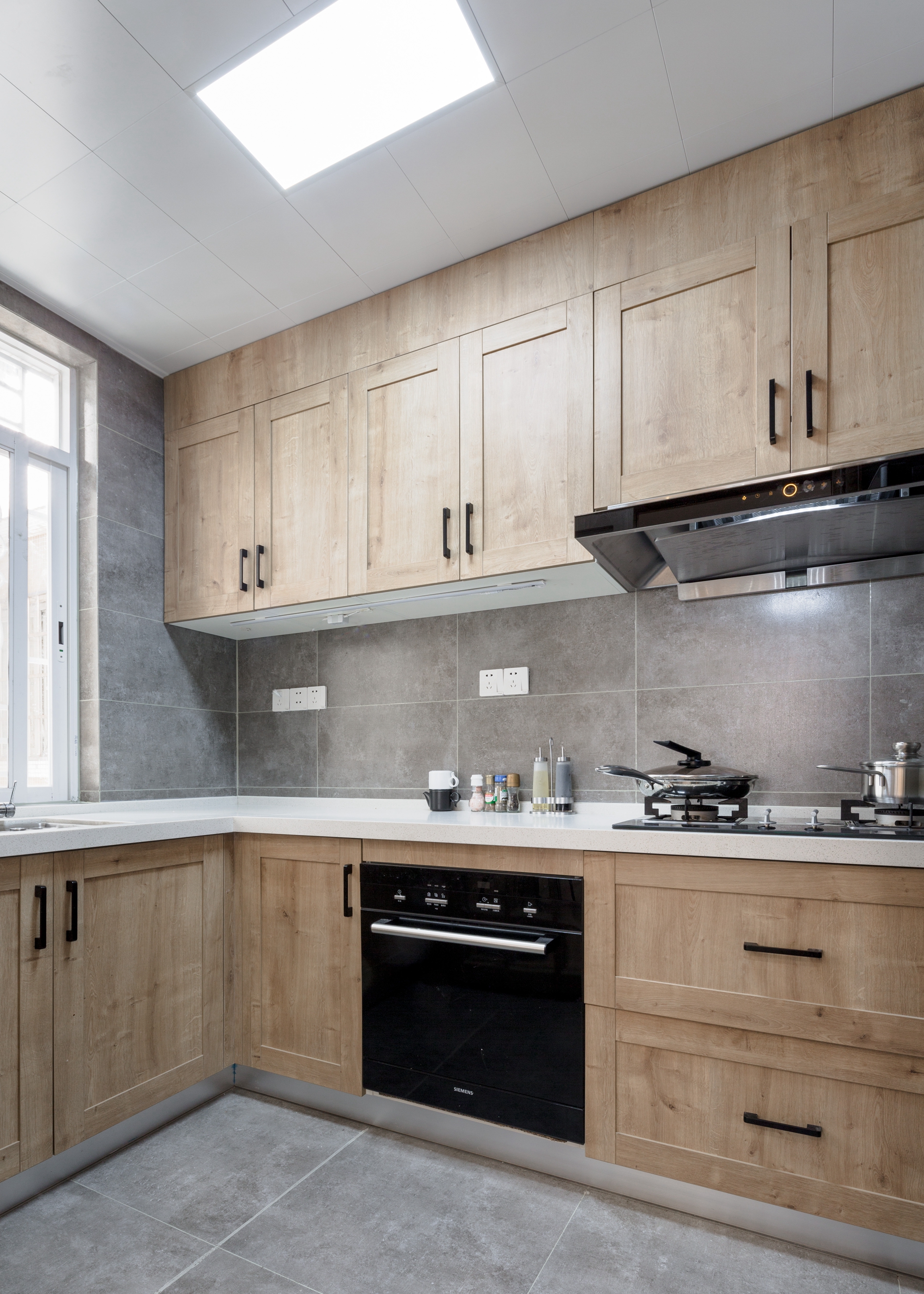 考虑到整体空间的整洁度与美观度,厨房的墙面、地面基本都是全部铺贴上瓷砖的,这时候就需要注意瓷砖的选择与搭配了。墙砖要考虑空间大小以及室内光线的照射度,自然采光优渥的厨房可以选择哑光瓷砖,避免光污染。空间偏小且采光不足的厨房,可以选择光泽感偏强的瓷砖。厨房地砖的选择上,主要考虑防滑耐磨。