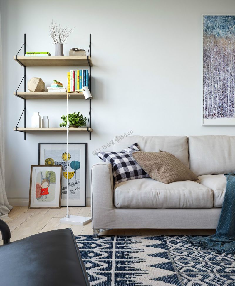 天江名邸北欧风格室内沙发背景墙置物架设计效果图