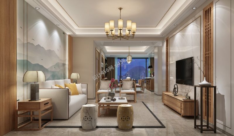 滨海国际125平米新中式风格三居室装修案例风效果图