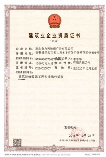 淮北市力天装璜广告有限公司品牌升级淮北力天工装装修,创立于2001年,是经安徽省建设厅批准。具有资质的装饰装璜综合性广告公司,在淮北享有广阔的市场和很高的美誉度。公司成立的18年时间里,先后承接各类大型装饰、装璜、广告、业务数百起,得到广大客户的一致好评。本公司专注:酒店、会所、商铺、办公楼、家居的装璜、各类广告制作及发布等。力天精湛的技术团队、先进的团队管理系统、严格的作业操作规程形成了以设计、施工、监理一体化全方位的优质服务系统。