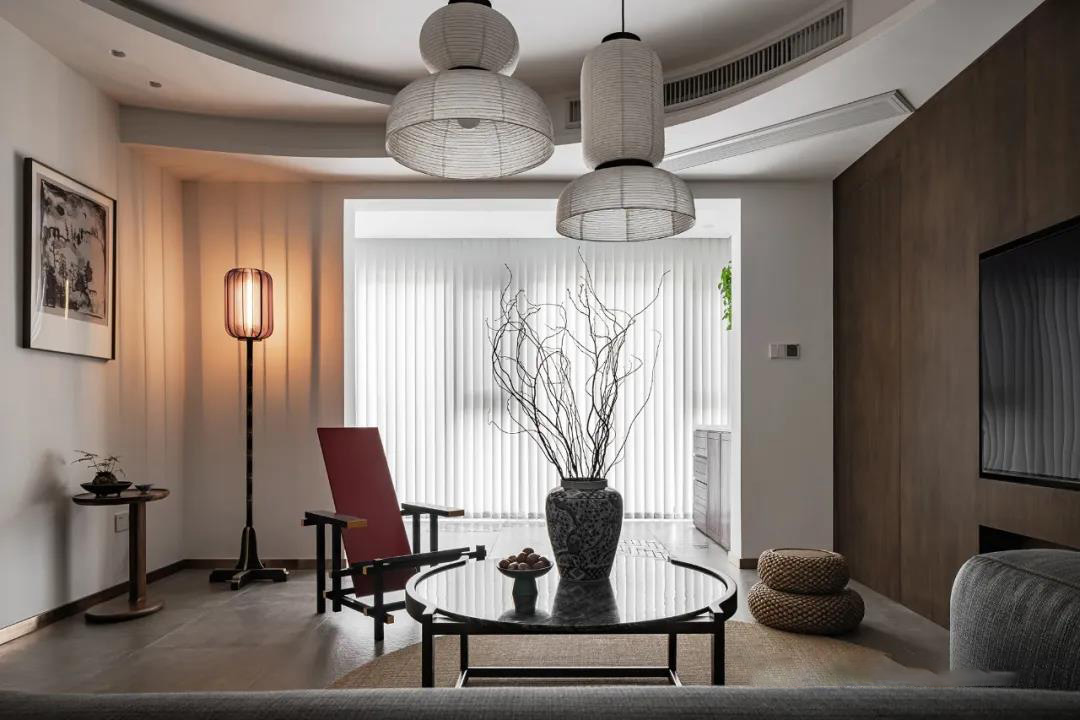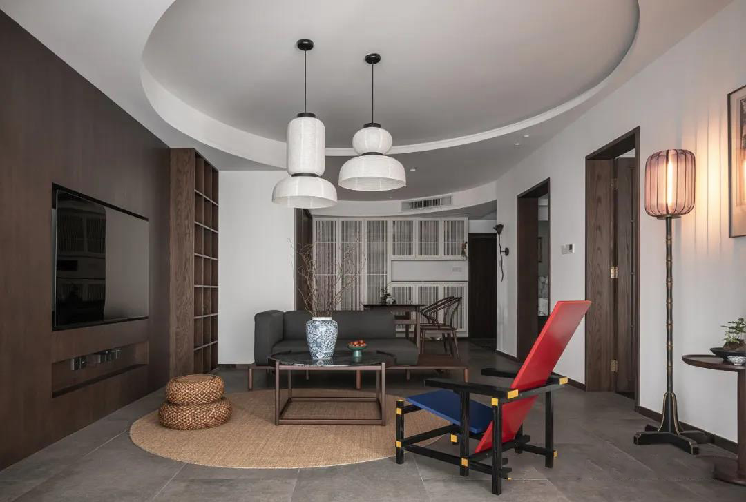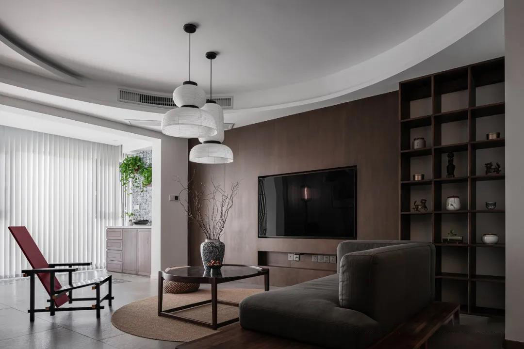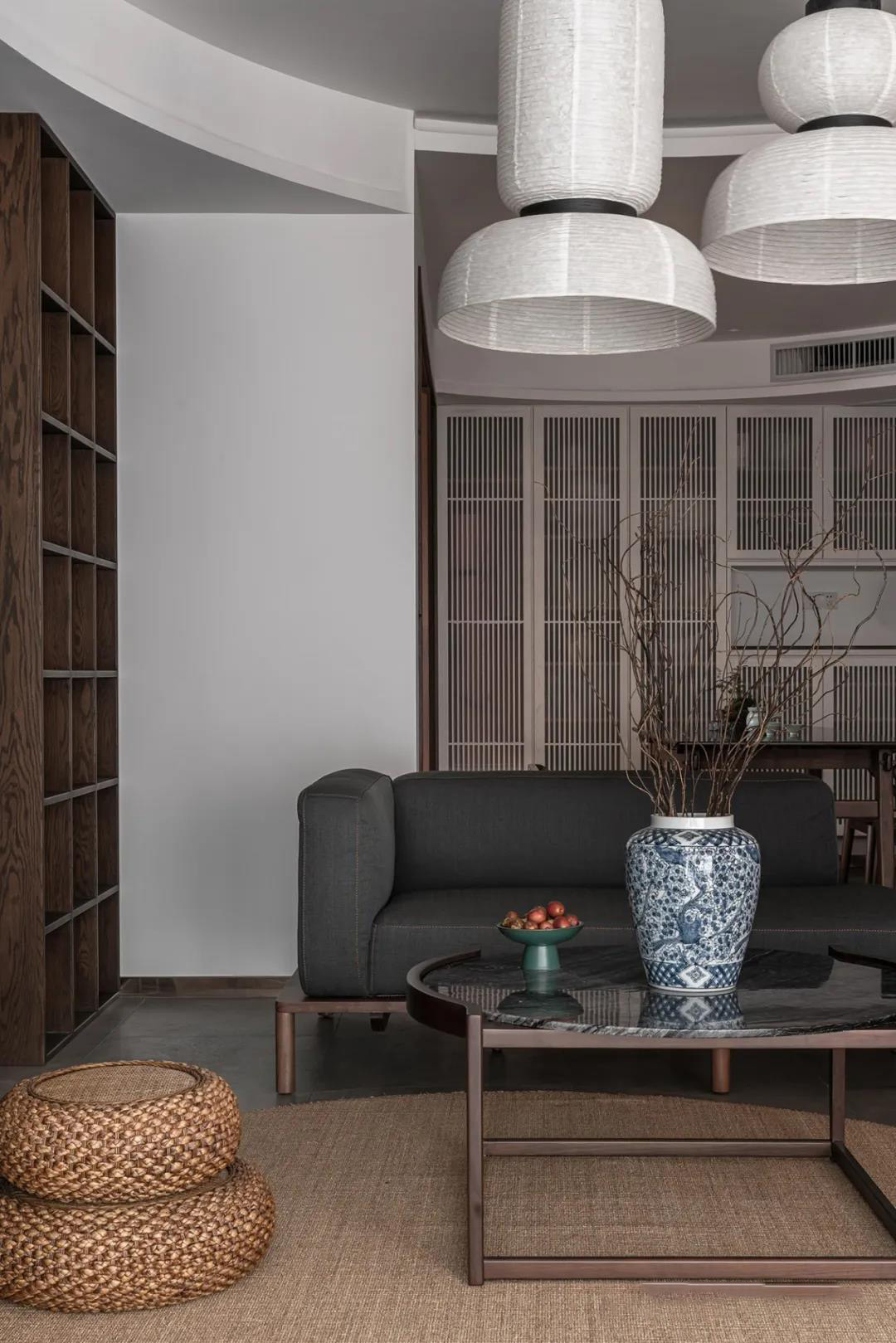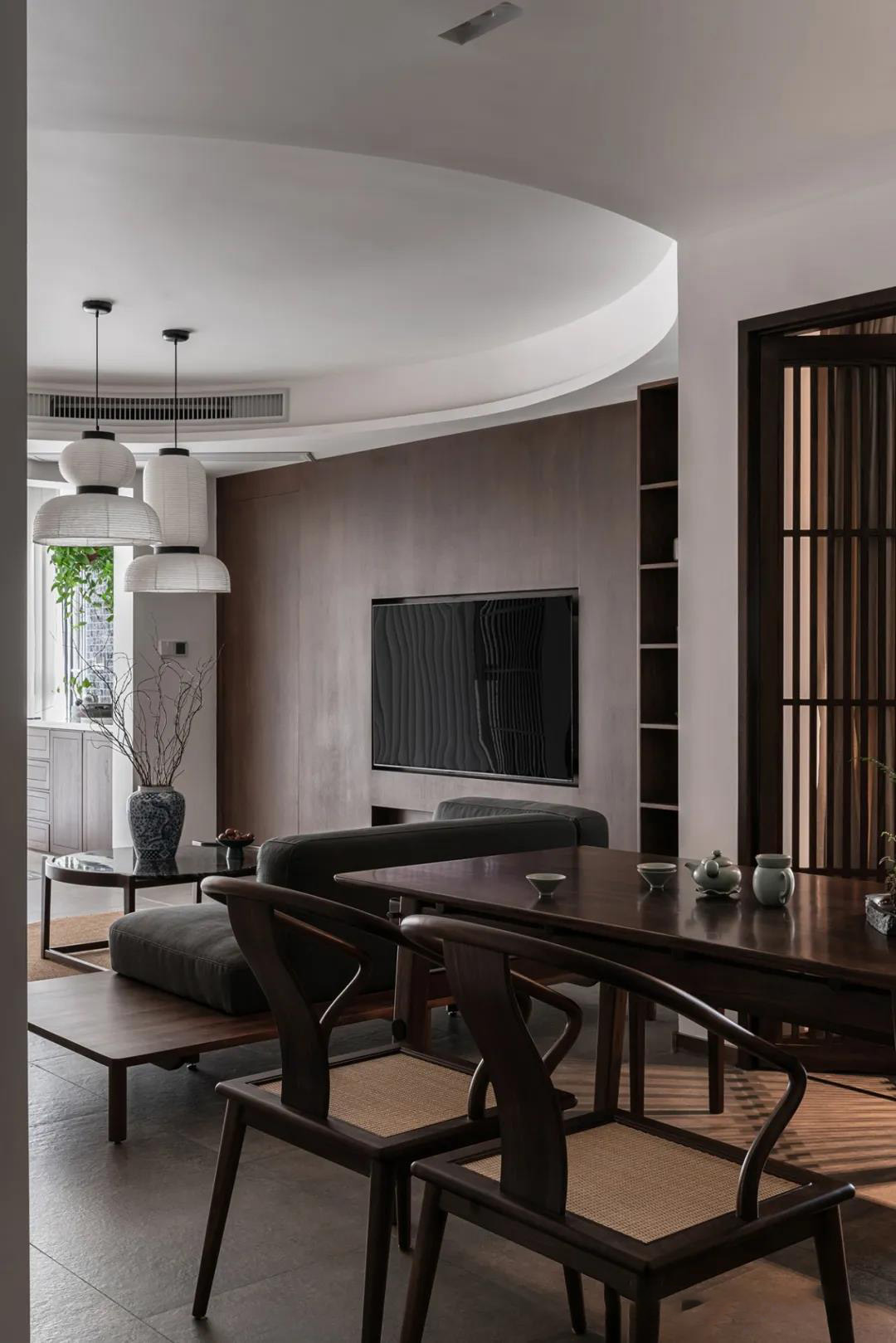 客厅层层叠叠的圆形顶面和光影婆娑的格栅自成一方天地,营造出清冷月下竹影的氛围。