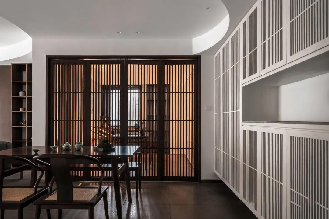 入户即可看见客餐厅,利用唐宋时期就被大量用在民间的格栅元素做隔断,奠定整个房子的中式基调,宋代的极 致风雅韵味在走进这个空间的瞬间迎面而来。