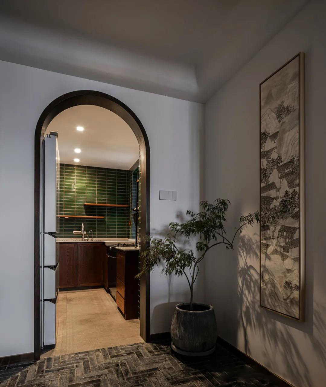 厨房与玄关用拱形门洞相隔,很好的借用玄关园林式的景色,现代厨房和暗青色的墙面瓷砖的碰撞增添生活仪式感。