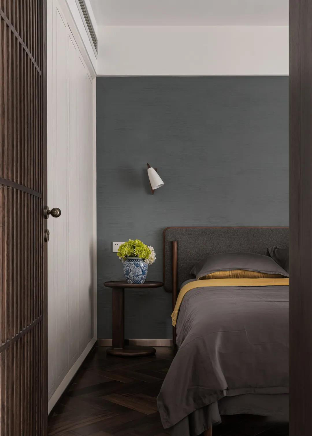 次卧隔出一部分做客卫,简约风格中渗透中式的雅致,格栅开门,青灰色背景搭配简约壁灯和大床,青花元素搭配毫无违和感。