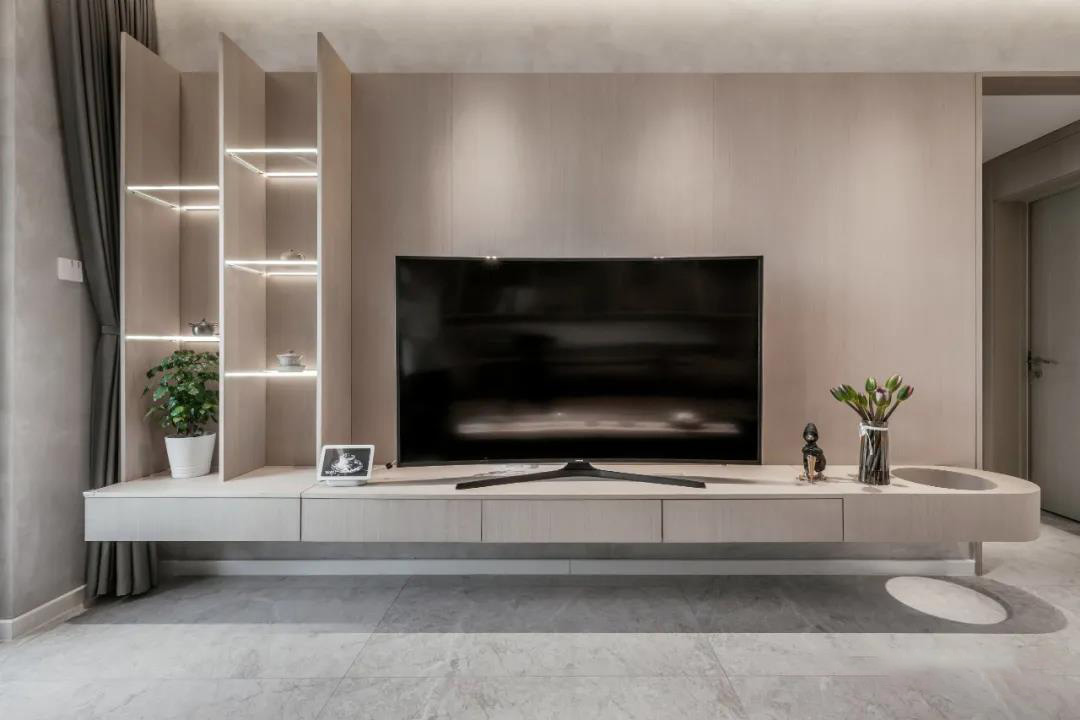 考虑到有屋主收藏茶具的爱好,在电视旁做了展示架。玻璃层板发光处理,让藏品观赏感更强。