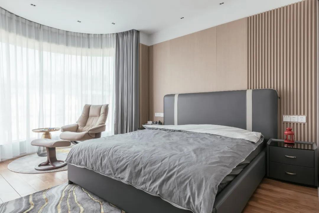 主卧采用无主灯照明,相比大灯,分散的筒灯,更有助于营造睡前的舒缓氛围。弧形的阳台纳入室内做为休闲区,惬意舒适。