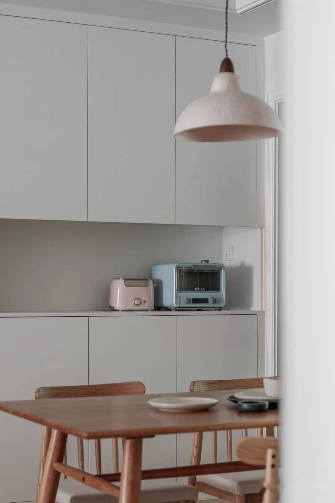 西厨定制储物柜预留操作台面是小家电的好去处,而樱桃木的餐桌椅是比原木更能表达醇厚的代表色。