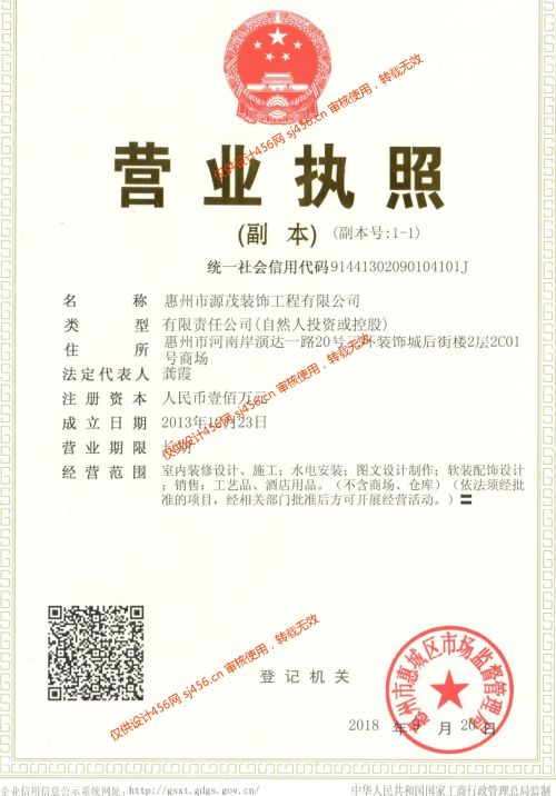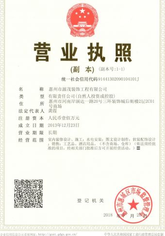 惠州源茂装饰工程有限公司是一家集装饰设计、工程施工、材料配送、主材代购、售后服务为一体的专业室内外装饰企业。主要从事住宅、公寓、办公、商业、酒店、学校、医院等场所的装修设计和施工。公司经广东惠州市工商管理局正式批准注册已取得国家正规资质的单位。15-30人设计团队/15支以上施工队。 企业核心理念——诚信、责任、主动、 企业人才理念——品德为先、勤奋认真、团结协作、共同成长、 企业核心文化:像家庭一样温暖人,像学校一样教育人,像军队一样要求人! 企业愿景:成为较受信赖的装饰公司!源茂装饰业务范围 承接住宅、公寓、办公、商业、酒店、学校、医院等场所的装修业务