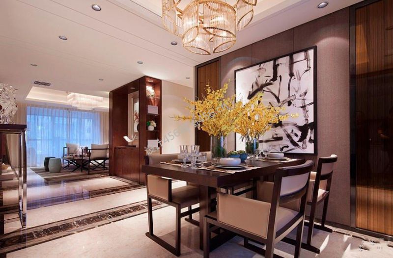三居128平新中式风格餐厅背景墙设计图欣赏