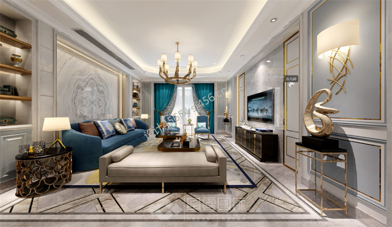 悦麒美寓300㎡欧式轻奢别墅客厅装修效果图