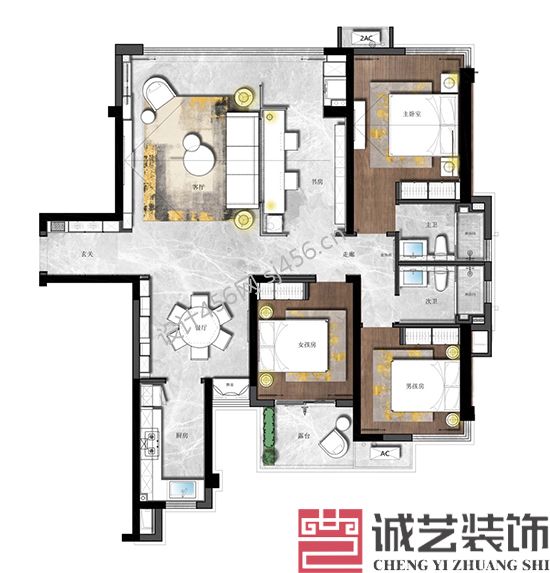 景德镇诚艺装饰 莱顿风情129平米三居室轻奢风格装修设计效果图