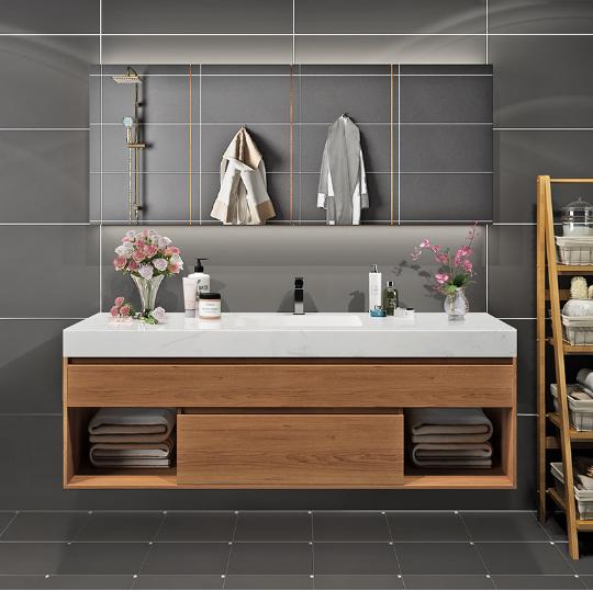 挂墙型的浴室柜与挂墙型的马桶从工作原理上完全一致,它是水管隐藏在墙体内部,同时底部留空,彻底解决了360°卫生无死角的问题,特别是有宝宝的家庭,选用浴盆无处可放时,可以借用浴室柜留空的位置,同时也是解决了收纳的一大难题。