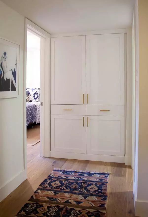 卧室外面走廊还打上了内嵌式的超大储物柜做墙面,对于业主和孩子两个人来说,储物空间完全够用了。而且内嵌式的装修风格也不会影响颜值,平时把门关上,白色的衣柜配上白色墙面看起来超舒适。
