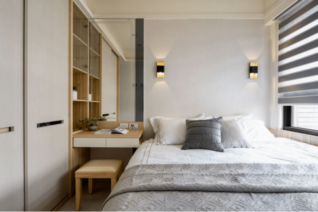 将角落的空间利用起来,把梳妆台桌面延伸至床头侧上,这样既不会破坏空间的完整性和美感。台面放置常用化妆品,不常用的放抽屉,轻松分类放。