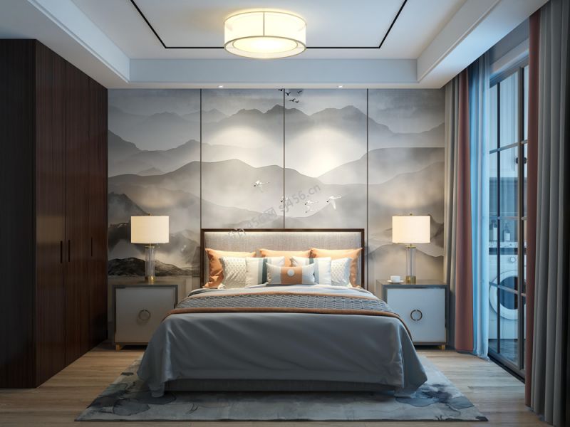 95平三居新中式卧室背景墙装修效果图