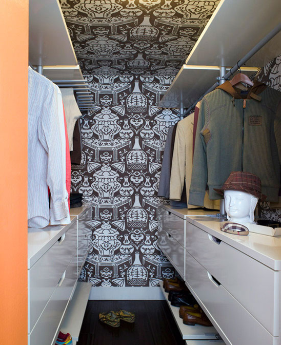 给空间划分出一个狭长的小空间,用来打造独立式衣帽间,两侧是对称的收纳配置,让小空间得到较高利用,上层作为悬挂,中间层作为抽屉,底层则用来收纳鞋子,装饰上也没有马虎,墙壁用美丽的壁纸包裹,充满趣味。